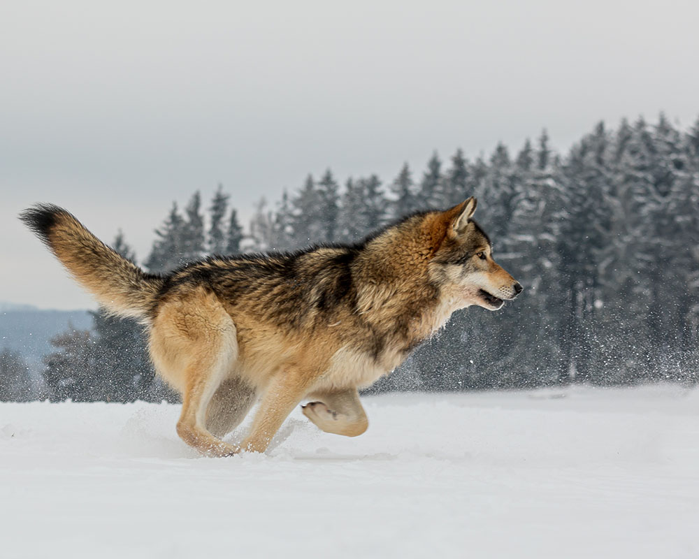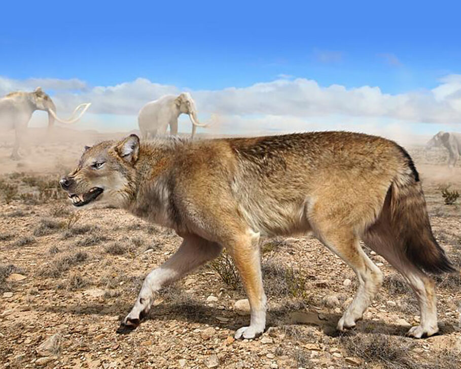 Right: An illustration of a hunting dire wolf (Aenocyon dirus) (Photo credit: Roman Uchytel)