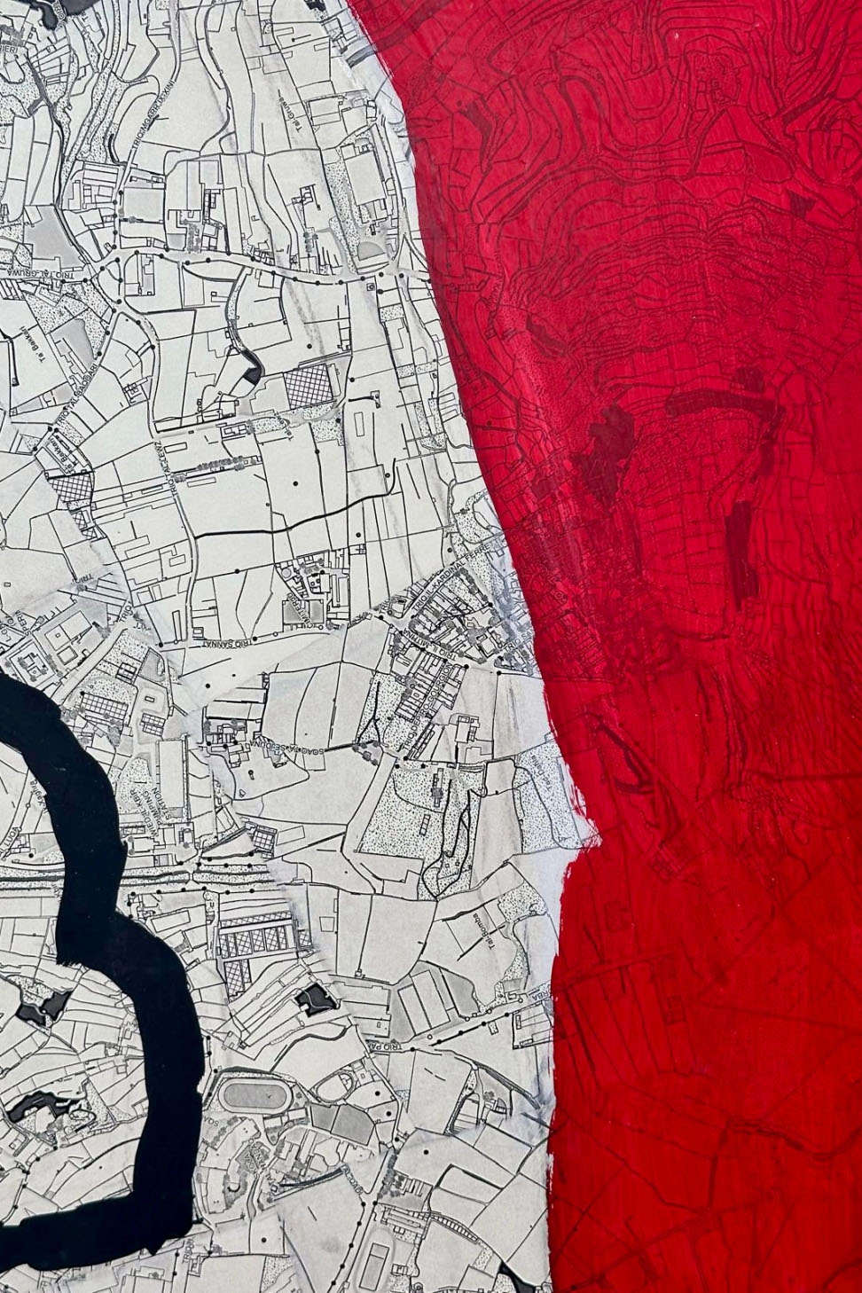 While Briffa and A. Camilleri deal with process, Caesar Attard and Pierre Portelli investigate fragmentation, that of body, land, and meaning. For Attard, the space of the work often evokes the human figure in flux. In Place, a mouth and body elements float suspended over the map contours. The terrain is dissected into tiles – a parcelling of land that echoes A. Camilleri’s. Attard’s work carries an analytical insistence, a desire to locate meaning, to explore what he calls perplexity. Yet there’s also an intuitive side, a sense of ‘travelling’, as he describes it, a movement into uncertain space.