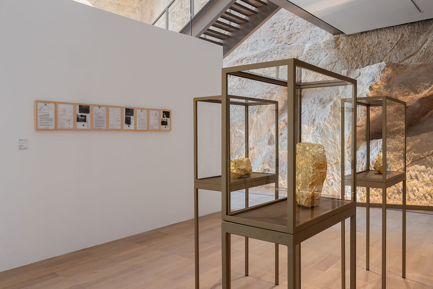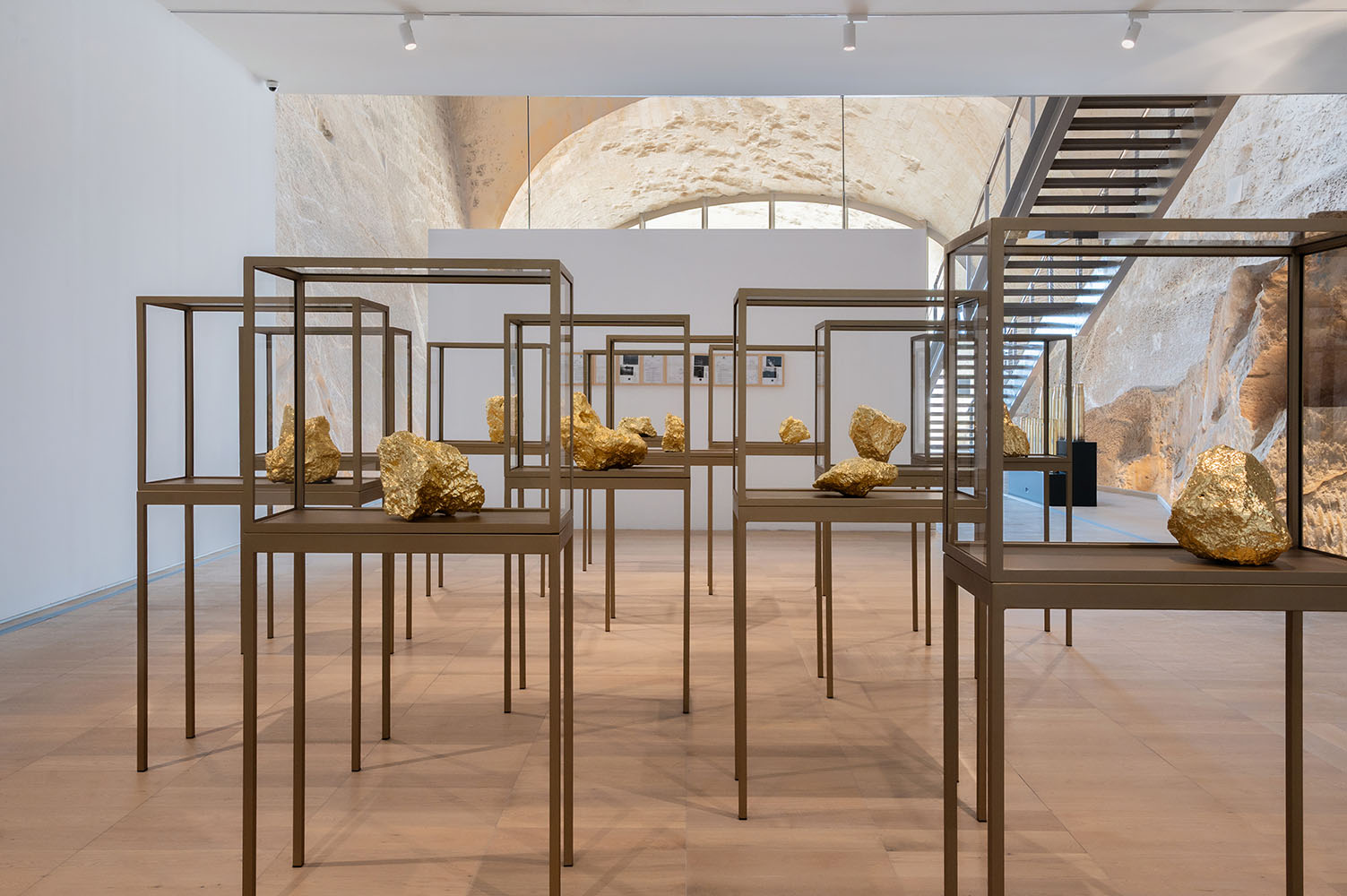 In parallel, A. Camilleri’s sculptural practice begins with a material premise but arrives at a philosophical proposition. ‘My practice is shaped with the materials I use,’ he declares. For his sculpture, he cast concrete tiles using materials ‘stolen’ from construction sites across Malta, a subtle, poetic reclaiming of land. These tiles are formed directly on the island’s terrain, imprinting the natural undulations of the land onto a material typically used to erase it. His gilded stone works, presented in cabinets remindful of museum vitrines, likewise transform the mundane into the sacred. For A. Camilleri, ‘place’ is not just a subject, but as he notes, ‘the distance between the work and the audience.’
