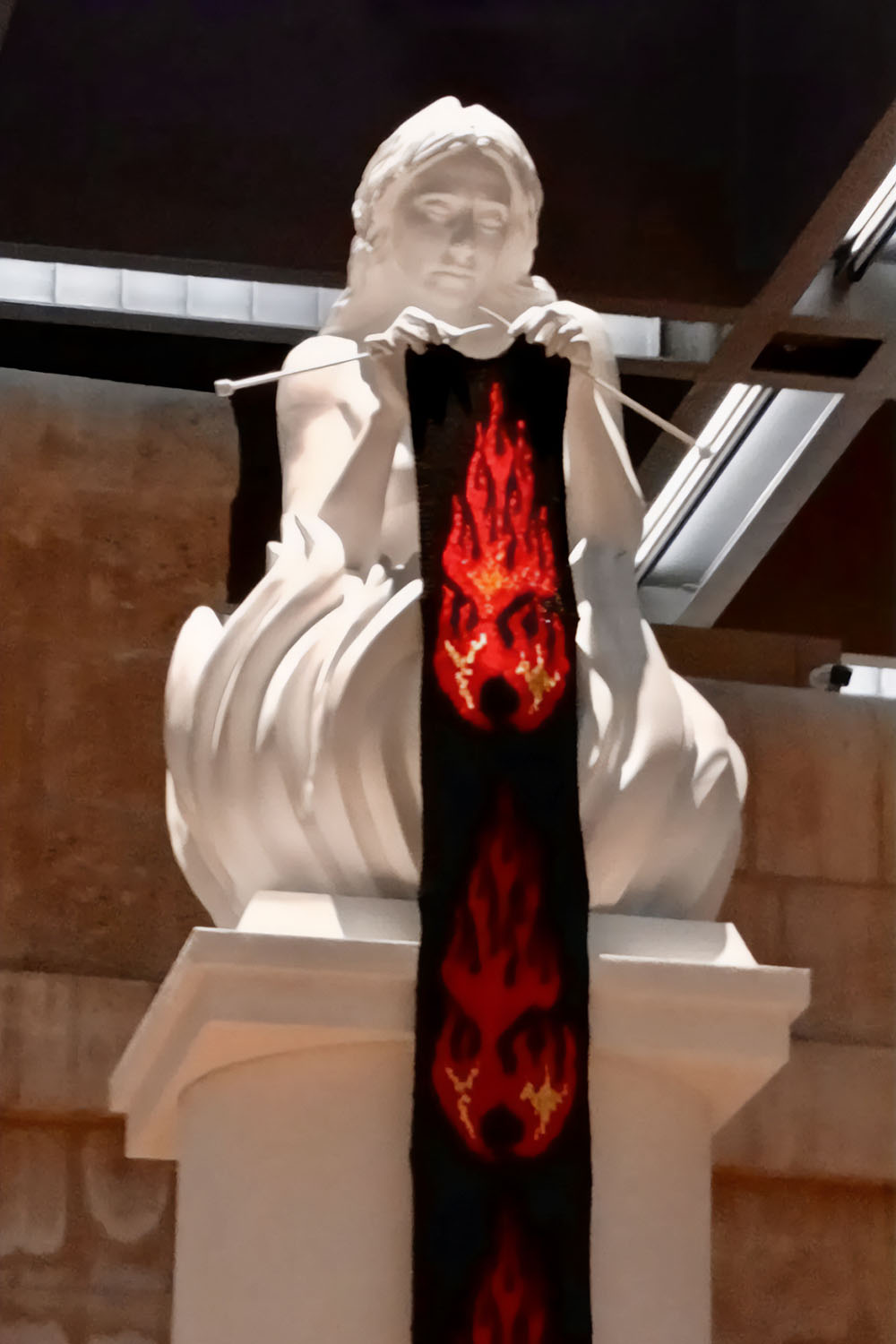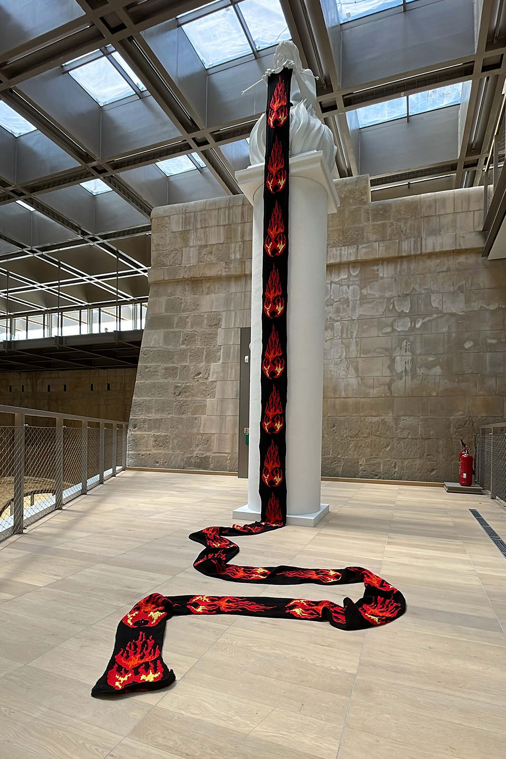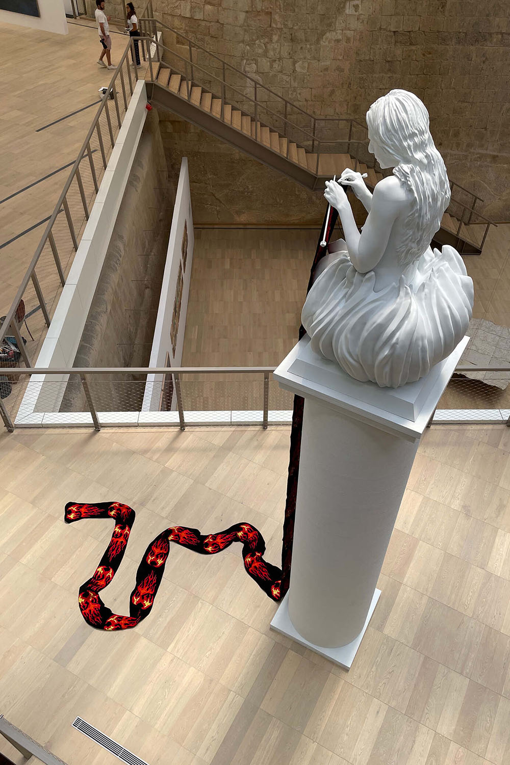 Pierre Portelli, on the other hand, strips back authorship. His conceptual approach steps away from the personal to let the audience complete the work. ‘It’s important for the audience to become part of what I create and what they perceive,’ he says. Even when the viewer is unaware of their role, they are always implicated. His works layer playful elements with heavy themes. In ġ–b-l, the ‘eye’ attached to a found rock only reveals its environmental message when the viewer catches its reflection, echoing the idea that truth often emerges indirectly. His installation Choir uses polished artillery shells arranged like a tiered chamber choir, with AI-rendered acapella voices performing Dido’s Lament. The sound flows upward as though from the earth’s core. Alongside this, his anima sola sculptures echo Southern Mediterranean religious iconography, lonely souls engulfed in flames and occupying purgatory in a liminal space. Here, Portelli examines the metaphysical space between viewer, object, and meaning.