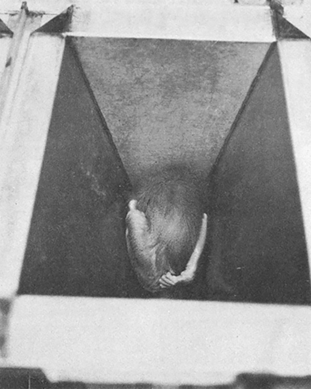 Despite all this, Harlow hadn’t yet created depression. The ‘breakthrough’ came with the vertical chamber apparatus – the ‘Pit of Despair’. Shaped like a narrow, inverted pyramid with the wide opening at the top covered in mesh, the device was suspended from a height. The monkey would be placed inside and would spend the first day or two trying to escape by scrambling up the steep sides, only to slide back down to the bottom. After two or three days, ‘most subjects typically assume a hunched position in a corner of the bottom of the apparatus,’ Harlow writes.