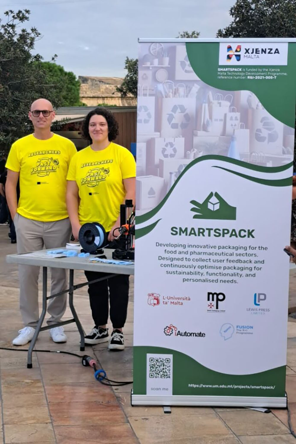 Alessandra Bianco (RSO) and Prof. Ing. Philip Farrugia (PI) representing SMARTSPACK at the Science in the City 2025 Festival: Past Forward (Photo courtesy of the SMARTSPACK Team)